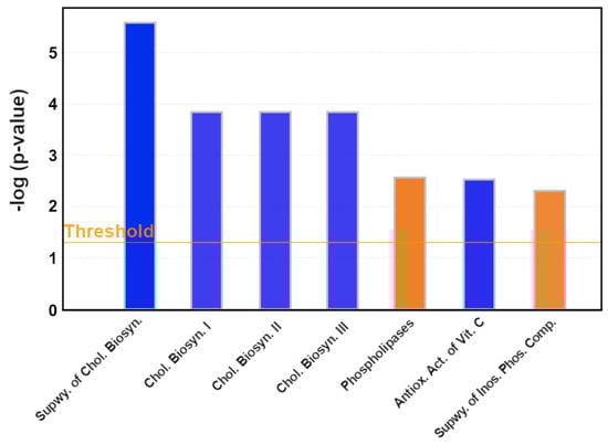 PFA significantly inhibited four cholesterol pathways, including the Super-pathway of Cholesterol Biosynthesis, Cholesterol Biosynthesis I, Cholesterol Biosynthesis II (via 24, 25-dihydrolanosterol), and Cholesterol Biosynthesis III (via Desmosterol) (Figure 2). The significance values for the canonical pathways were calculated using the right-tailed Fisher’s Exact Test to determine enrichment. The supporting data, including the altered gene list, is given in Table S1 of Supplementary File S1.