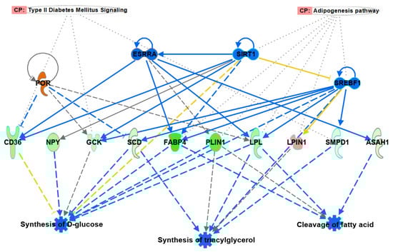 The Regulator Effects analysis in IPA identified five predicted regulatory networks which combine multiple upstream regulators expressed in our dataset to identify the significant influence of their activation/inhibition in our dataset on the regulator-controlled disease and functions. The top-scoring network (Figure 3) shows how activation of POR and inhibition of ESRRA, SIRT1 and SREBF1 results in altered gene expression of 10 target genes, which affects the significant inhibition of synthesis of glucose, triglycerol and cleavage of fatty acids. This was tightly connected with the reduction of Type 2 diabetes signalling and the Adipogenesis pathway, contributing to reduced development and accumulation of adipose tissue (fat) across all body locations, both as subcutaneous fat and as depots.