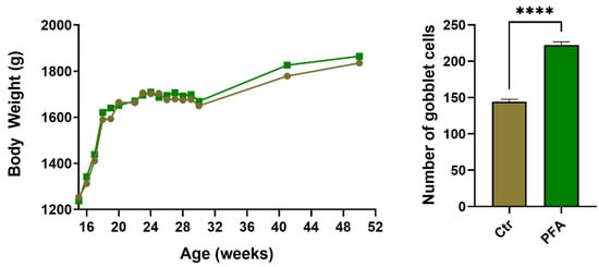 Bird body weight of the birds from the start of PFA supplementation and histological examination showing a significant increase in the number of ileum goblet cells (**** = p < 0.0001).