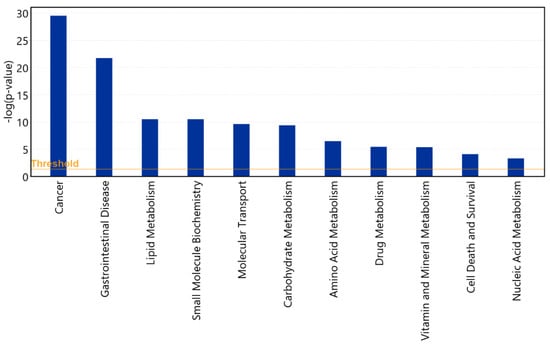 Similarly, nine categories of Lipid metabolisms were decreased in the Disease and Functional analysis. Notably, the metabolism and synthesis of sphingolipid (SL) were decreased. Sphingolipids with sphingosine-1-phosphate (S1P) and ceramide are important biomolecules with extensive effects on vital cellular processes, including programmed cell death, cell growth, and proliferation []. The perturbations of SL metabolism will change the responsible enzymatic pathways, which in turn can take part in the progression of various cancer cells such as colon [] and breast cancer []. Nagahashi et al. (2016), through an in vitro experiment, demonstrated that cancer cells in breast cancer contain a higher amount of SL than in normal breast tissue []. Other lipid-related inhibited categories include Metabolism and Synthesis of triacylglycerol, Cleavage and Hydrolysis of fatty acids, Hydrolysis and Catabolism of lipid, and Lipolysis, which could have led to perturbation in the lipid metabolism preventing the tumour-adipose microenvironment. This is in agreement with phytogenic supplementation reducing the disease susceptibility for numerous cancer categories, including breast and colorectal cancers.