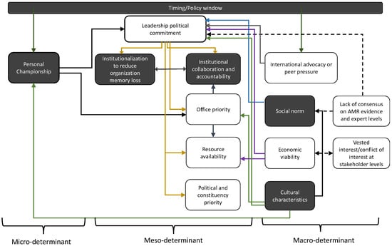 AMR policy protagonists consider multiple variables in their policy advocacy and implementation process. The main themes identified are indicated in black boxes. Solid arrows depict how variables are opined to have facilitated advocacy and/implementation. Dashed arrows depict deterrents in policy development. Yellow arrows depict political, green depict cultural, purple depict economic, and blue depict social characteristics. Micro-, meso-, and macro-determinants are bracketed.