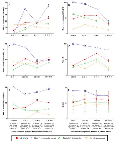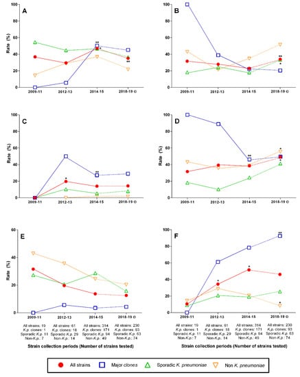 2.3. Changing Rates of Major Clones, Resistance Genes, and Antibiotic Nonsusceptibility over Time