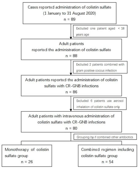 This retrospective study enrolled patients admitted to the hospital from 1 January to 31 August 2020. Forty-nine hospitals (all members of CHINET, the China Antimicrobial Surveillance Network) from 13 provinces in China participated in this study. Eighty-nine cases reported the usage of colistin sulfate during the study period and finally 80 cases were included (Figure 1). The inclusion criteria were as follows: (a) intravenous administration of colistin sulfate (dose of 1–20 million U/kg); (b) age ≥ 18 years; (c) diagnosis of hospital-acquired pneumoniae, blood infection, urinary tract infection, acute suppurative peritonitis, or acute suppurative meningitis; and (d) isolated CR-GNB from lower respiratory tract secretions, blood, mid-stream urine, abdominal drainage, cerebrospinal fluid, or other specimens. The exclusion criteria were as follows: (a) CR-GNB considered as colonization strains according to the history; (b) infections caused by combined Gram-positive coccus; (c) colistin sulfate and other antimicrobial agent administration <72 h after CR-GNB isolation; and (d) kidney dysfunction (acute renal damage, chronic kidney disease stage 3 or more) or receiving renal replacement therapy.