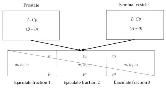 CP and CV were estimated using SAS® version 9.3 (TS1M1) based on fosfomycin, fructose and PSA concentrations measured in seminal plasma, cs, b and a, respectively, as previously described [10,11,12]. The methodology postulates the possibility to collect the very first, infinitesimal, unmixed semen fraction, which would show PSA and fructose concentration as follows: aj = A and bj = 0, with PSA at its concentration inside the prostate, A and fructose still absent. Similarly, in the last fraction, aj = 0 and bj = B. Given that the real concentrations are a result of mixing within the urethra, the above-mentioned conditions are only postulated. However, the intermediate fractions represent a progression between these 2 extreme conditions as shown in Figure 1. The profile of PSA vs. fructose is therefore linear with a negative slope, and the axis intercepts indicate concentrations in cognate glands of origin.