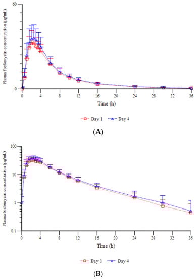 On Day 1, the fosfomycin levels rapidly increased in the plasma after the single dose. The highest observed concentration was 32.271 ± 7.634 µg/mL, attained on average 2.5 h postdose. After the peak, fosfomycin decreased in the plasma until 36 h postdose, when it was below the quantification limit in half of the subjects.