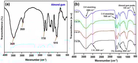 The almond gum was subjected to FTIR analysis in order to determine it by seeking for functional groups in it (Figure 1a). The strong peak seen at 3429 cm−1 is a characteristic peak of O-H stretching vibrations. The asymmetric -CH2- functional groups correspond to the peak at 2920 cm−1. The distinctive peak at 1735 cm−1 is attributable to the carbonyl group’s stretching vibrations. The peak observed at 1015 cm−1 is because of bending of arabinosyl chains. These functional groups’ existence indicates the almond gum includes the prior stated compounds [22,23]. The FTIR spectra reveal interactions in the composites between carbonyl group (-C=O) of chitosan and the C-H stretching modes of almond gum. The peaks at 3393 and 2924 cm−1 in Figure 1b indicates the chitosan O-H stretching and C-H vibration, respectively. In accordance with the C-C stretching vibrations and C-O stretching modes, the peak at 1553 and 1415 cm−1 is placed. Stretching from C=O reaches 1640 cm−1. The 1430 cm−1 peak represent CH2 bending vibrations. In Figure 1b, the peaks at 530 cm−1 indicates the presence of almond gum stretching mode and all other peaks are due to the presence of soluble chitosan. The spectra of the chitosan/almond gum composites clearly show characteristic peaks corresponding to individual groups of chitosan. That is, the FTIR spectra of the CS composites show no change or shift in the characteristic peaks of pure chitosan with the addition of almond gum.