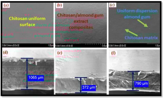 The SEM micrographs and cross-section images of chitosan, almond gum and CSA composites are shown in Figure 2. The surface topology of CSA film compared to chitosan is observed and found that, these films observed that they do not show many changes in their microstructure which means their physical properties do not affect the concentration of almond gum on the film. Figure 2a shows that the microstructure of the neat CS film surface was smooth and uniform of CS. Meanwhile, the addition of 30 wt. % of almond gum to the CS film (Figure 2b) reduced the size of granules and improved the surface structure. As can be seen from Figure 2b, the film with 30 wt. % chitosan indicated uniform and smooth structure, and a few almond gum particles also appear on the film surface. However, when the amount of almond gum was increased to 50 wt. %, the almond gum was effusively blended with the CS. The surface structure from Figure 2c was smoother than Figure 2b, but more almond gum appeared on the surface of the film compared to that with 30 wt. % of almond gum. Since no shift is observed as a result of chitosan and almond gum interaction in composite materials, the existence of almond gum in the composite films displays outstanding reinforcing dispersion, without noticeable voids. This might be due to the even distribution of almond gum in the chitosan as well as good compatibility of the matrix.