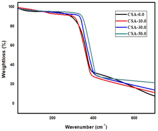 The TGA curves of chitosan, chitosan/almond gum composites are shown in Figure 3. The weight loss at 50–160 °C is due to the moisture vaporization and the initial weight loss at 220–380 °C is due to the degradation of chitosan. Three weight losses were observed in the composites of chitosan and almond gum. The degradation of almond gum is the main reason of the 410 °C. The initial degradation of the CSA-10.0, CSA-30.0, and CSA-50.0 was further increased by the addition of 10.0, 30.0, and 50.0 wt. % of almond gum at 248, 295, and 380 °C, respectively. Chitosan/almond gum composite films were more stable thermally as pure chitosan, as shown by thermal stability changes in the film that were found as a result of the addition of almond gum in chitosan. After the incorporation of almond gums, the degradation curve shifted to higher temperatures; a higher almond gum loading led to a higher decomposition temperature. Additional residues were detected in the composites due to the good thermal stability of the almond gums.