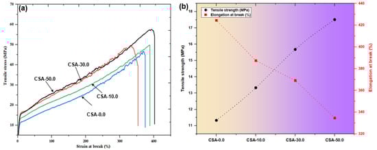 (a) Stress versus strain curves; (b) Tensile strength and elongation at break of CSA composites.