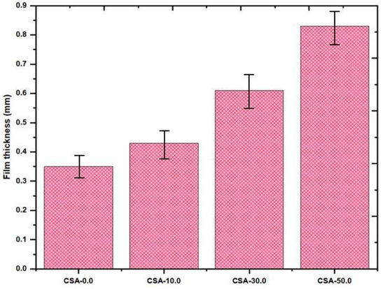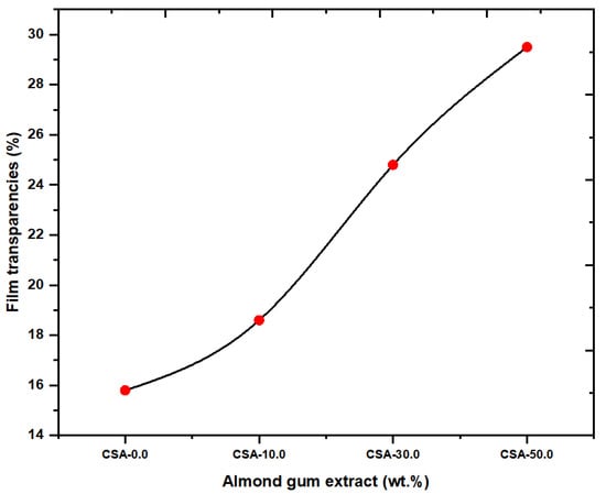 The visual monitoring of the product’s excellence throughout preservation and aesthetic appeal to customers depends on the transparency of food packaging films. Figure 6 shows the transparency values of chitosan and chitosan/almond gum composites. The opacity value of chitosan is 15.8 A/mm. After the loading of 50.0 wt. % of almond gum, the opacity value increases to 29.5 A/mm. The maximum transparent of the four composites was CSA-50.0, which was also the opaquest. The aggregation of almond gum in the polymer affects the light scattering property and hence by adding the almond gum, the opacity level of the film was increased. Similar results in the transparency value for the chitosan composites were reported by Sanuja et al. [24]. Even if the values were decreased, the CSA film’s characteristic transparency suggests that adding almond gum could not have a significant effect on its appearance when used for packaging applications.