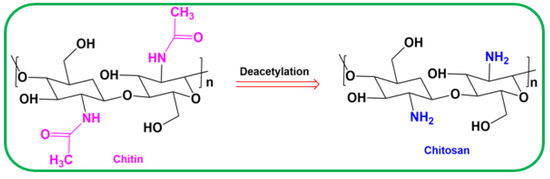 The chitosan was prepared by using method briefly mentioned in the literature [24]. In total, 250 g of crab shells were used, after being fully cleaned with water to eliminate all impurities, and then oven-dried at 110 °C. The shells were crushed to powder and been for 30 min at 60–70 °C with constant stirring while receiving an addition of 2% NaOH. Distilled water was used as a filter, and the process was repeated till the solution was colorless and clear. A 10 mL volume of HCl was added to the mixture as a confirmation. A total of 50 g of chitin was obtained after the product was dried at 60 °C overnight; this procedure is also known as demineralization. The repeat units of β-(1-4)-2-amino-2-deoxy-β-D-glucose are noticed in the acetamide group found in chitin and chitosan, a derivative of chitin (Figure 10). The functionality is commonly given by deacetylating chitin in basic media, which leads to the hydrolysis of the acetamide group to yield chitosan and acetic acid. The degree of deacetylation can be used as measurement unit for this mechanism. The extensive primary amine groups found in chitosan have been associated to all these properties.