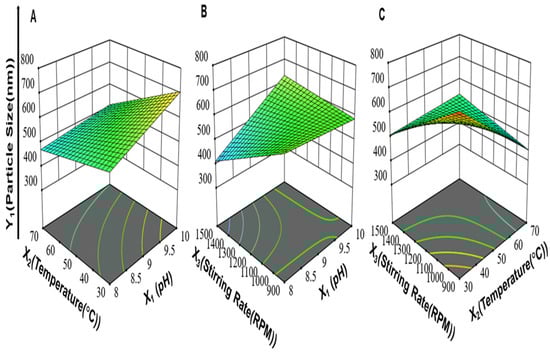 Moreover, the interaction between pH and the stirring rate (X1X3) and the interaction between the reaction temperature and stirring rate (X2X3) had positive effects on the particle size of ZnO-NPs. On the other hand, the interaction between pH and the reaction temperature (X1X2) had a negative effect on particle size. The 3-D response surface plots for (X1X2), (X1X3), and (X2X3) on the particle size of ZnO-NPs are illustrated in Figure 1.