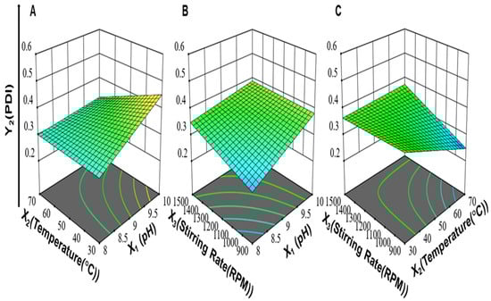 The 3-D response surface plots for (A) the interaction between pH and reaction temperature (X1X2), (B) the interaction between pH and stirring rate (X1X3), and (C) the interaction between reaction temperature and stirring rate (X2X3) on PDI (Y2) of ZnO NPs while keeping the third variable at an average value between its high and low levels.