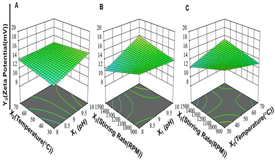 The interaction between the reaction temperature and stirring rate (X2X3) and the interaction between pH and the stirring rate (X1X3) had a positive effect on the zeta potential, while the interaction between pH and the reaction temperature (X1X2) had a negative effect on the zeta potential as shown in Figure 3. Moreover, the interaction between the pH, reaction temperature, and stirring rate (X1X2X3) had a positive effect on the zeta potential.