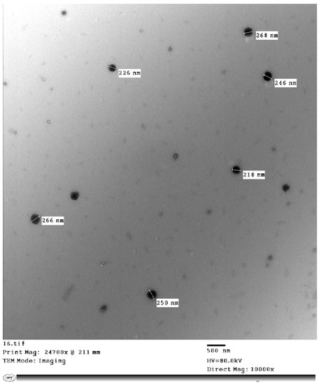 ZnO-NPs were imaged using TEM (H-700, Hitachi Ltd., Tokyo, Japan) at an accelerated voltage of 80 kv using a negative staining method following our previously published protocol [2,7]. Briefly, the sample was diluted (1:50) with double-distilled water and then a drop of the diluted sample was applied to a mesh copper grid coated with a carbon film and was left to dry for 5 min. After this, a drop of the phospho-tungstic acid solution (2% w/w) was added to the grid for 50 s and the excess liquid was removed using filter paper. The grid was left to air-dry in advance of imaging. TEM imaging was performed for the identification of the sample’s uniformity, shape, size, and presence of any aggregation.