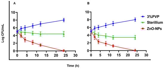 A time–kill curve study was performed to determine the effective time of antibacterial activity of the ZnO-NPs solution. Briefly, an overnight culture of MRSA and A. baumannii adjusted to 5 log cfu/mL was inoculated with the MIC of the freshly prepared ZnO-NPs solution vs. Sterillium. The inoculum was taken at time intervals and serially diluted in dilution fluid (0.9 NaCl and 1% peptone). One hundred microliters of each dilution were then spread over the surface of well-dried TSA, followed by incubation for 18–24 h at 37 °C. Colonies were then counted, and the percentage of growth inhibition in comparison to controls was calculated. Two independent experiments were performed in triplicate in each experiment for each tested sample.