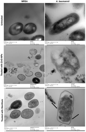 Fresh bacterial growth cultures of MRSA and A. baumannii were separately grown overnight in the presence of ZnO-NPs and Sterillium at a concentration less than the MIC. Bacterial cells were washed twice with PBS (1.5 mL, pH 7.2) and then fixed with glutaraldehyde in PBS (2% v/v). The samples were post-fixed with OsO4 (1% w/v) in PBS (5 mmol/L) for 1 h at room temperature, washed three times with the PBS buffer, dehydrated in graded ethanol, and then embedded in epoxy resin.