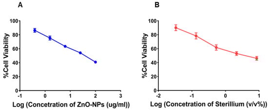 The MTT Cytotoxicity Assay was performed following our previously published protocol [2]; briefly, HDFa cells (4.5 × 103 cells/well) were seeded into 96-well culture plates. The complete culture medium (100 µL; EMEM with FBS (10% v/v), Earle’s Balanced Salt Solution, nonessential amino acids, L-glutamine (2 mM), sodium pyruvate (1 mM), sodium bicarbonate (1500 mg/L), penicillin G sodium (10.000 UI), streptomycin (10 mg), and amphotericin B (25 µg) were added to the cells, followed by incubation for 24 h at 37 °C and 5% CO2. Tested samples were diluted with the complete culture medium to prepare a set of serial concentrations. Subsequently, the complete culture medium was removed from each well, and the diluted tested samples (100 µL) were added, followed by incubation for 24 h at 37 °C and 5% CO2. Then, the culture medium containing the formulations was removed, and a fresh complete culture medium (100 µL) was added. The MTT reagent (20 µL, 1 mg/mL) was added to each well, followed by incubation for 4 h at 37 °C and 5% CO2. This was followed by carefully removing the complete culture medium and adding the solubilizing agent to dissolve formazan crystals followed by calculating the percentage of cell viability. A set of control samples was prepared, and untreated HDFa cells and cells treated with blank samples (3% PVP, vehicle used to disperse ZnO-NPs) were also tested under the same conditions.