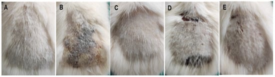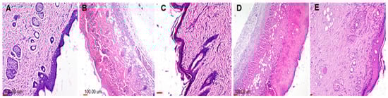 In a routine manner, formalin-fixed skin specimens were dehydrated in different grades of alcohol followed by clearance in xylol and embedding in paraffin. Serial sections 4–5 μm thick were obtained from the prepared paraffin blocks followed by their staining with Hematoxylin and Eosin (H&E) [48]. Histopathological findings in the skin were graded semi-quantitatively according to [49] with some modifications (0 = no abnormality, 1 = slight, 2 = mild, 3 = moderate) for each of the seven findings—hypertrophy, hyperkeratosis, parakeratosis, erosion, inflammatory cell infiltration, extracellular edema, and ulcers.