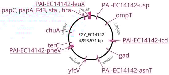 The EC14142 whole genome shotgun sequence was deposited in DDBJ/ENA/GenBank under the Bioproject accession number (http://www.ncbi.nlm.nih.gov/bioproject/784618, accessed on 29 April 2022) and reference BioSample accession SAMN23497059 (https://www.ncbi.nlm.nih.gov/biosample/23497059, accessed on 29 April 2022). The raw sequence data have been submitted to the Sequence Read Archive (SRA) (https://submit.ncbi.nlm.nih.gov/about/sra/, accessed on 9 April 2022) under study accession number PRJNA784618 (https://www.ncbi.nlm.nih.gov/sra/PRJNA784618, accessed on 9 April 2022). The de novo assembly of the five PAIs detected in the current study were deposited in NCBI using BankIt tool under the accession numbers (OM100123-OM1OO127) for PAI-EC14142-leuX, PAI-EC14142-asnT, PAI-EC14142-pheV, PAI-EC14142-icd, and PAI-EC14142-usp, respectively (accessed on 29 April 2022).