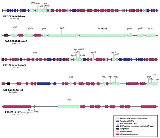 Schematic genetic representation of PAIs: PAI-EC14142-leuX, PAI-EC14142-asnT, PAI-EC14142-pheV, PAI-EC14142-icd, and PAI-EC14142-usp belonging to UPEC EC14142 isolate. The arrows indicate open reading frames (ORFs) with the green, purple, light blue, navy blue, black, grey, and red parts representing virulence factor-encoding genes, functional ORFs, non-functional ORFs (e.g., due to internal stop codons or frameshifts), ORFs without homology on the DNA level, integrases, transposases, and tRNA-encoding genes, respectively.