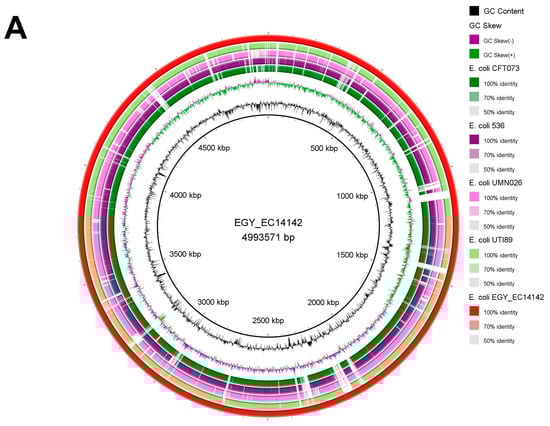 The generated contigs with hits of > 98% identity were combined manually and aligned against the prototype UPEC strain 536 to be used as a reference sequence using Basic Local Alignment Search Tool nucleotide (BLASTn) (https://blast.ncbi.nlm.nih.gov/Blast.cgi, accessed on 5 April 2022) to obtain the whole chromosome sequence designated as EGY_EC14142. The constructed chromosome was mapped against E. coli (taxid:562) using BLASTn and annotated using NCBI Prokaryotic Genome Annotation Pipeline (PGAP) (NCBI Prokaryotic Genome Annotation Process (nih.gov)). The map of EGY_EC14142 was displayed through Geneious software (v2022.0, Biomatters, https://www.geneious.com, accessed on 5 April 2022).