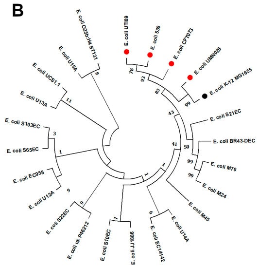 A maximum likelihood phylogenetic tree of 23 UPEC strains (19 UPEC belonging to ST131 clade C, including EC14142, and four referral strains) was constructed using MEGA software (v11.0.9) with 100 bootstraps (Figure 3B). E. coli K-12 MG1655 was set as a reference. This clone has become the most predominant lineage that is associated with a variety of infections around the globe [,]. Moreover, the ST131 clone is successfully disseminated worldwide due to its virulence and multidrug resistance ability as well as its epidemic potential [,]. Upon inspecting the generated phylogenetic tree, it was noticed that, although they were residing on distinct branches, the compared isolates showed relatedness. EC14142 was clustered with E. coli U14A (CP035516.1) which was recovered from a urine sample in Australia. This cluster exhibited relatedness to E. coli M45 (CP080119.1), E. coli M24 (CP080120.1), and E. coli M70 (CP080118.1) which were obtained from different urine samples in the Czech Republic, while E. coli BR43-DEC (CP035377.1) was obtained from a uropathogenic clinical sample in Brazil, and E. coli S21EC (CP076689.1) was isolated from a UTI patient in the United Kingdom. The referral strains were subclustered from a single branch, indicating the close clonality of these strains.