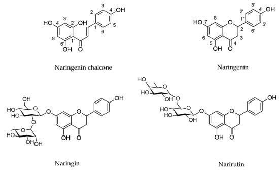 Naringenin (5,7,4′-trihydroxyflavanone) is an aglycone, which is a derivative of hydrogenated flavone, belonging to the group of flavonoid compounds, which are a part of a huge group of polyphenols. It is also produced by the cyclization of 2′,4′,6′,4-tetrahydroxychalcone (naringenin chalcone) (Figure 1). This bioflavanone occurs naturally in an inactive form as naringin and is converted into its active form, naringenin, by bacteria belonging to the gut microbiome []. This, one of the most important representatives of flavonoid compounds, is a component of the everyday human diet, where it is responsible for the color and bitter-sour taste of food. The best sources of it are grapefruit, sour orange, tart cherries, tomatoes, grapes and Greek oregano. It is also found in smaller amounts in bergamot, beans, fenugreek, milk thistle, tea, coffee, cocoa and red wine []. Although almost all citrus fruits are source of flavonoids for humans, their concentration varies and depends on the type, variety, harvest time and environmental conditions in which they grow.