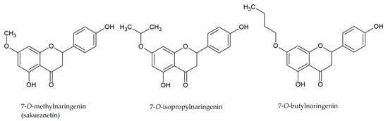 Among naringenin derivatives, one of the most described compounds are ether derivatives of naringenin. O-alkyl derivatives of naringenin also occur naturally in plants of the Boraginaceae family, e.g., 5-O-methylnaringenin, 7,4′-di-O-methylnaringenin, 7-O-methylnaringenin (sakuranetin) and isosakuranetin (4′-O-methylnaringenin) (Figure 2) [,,]. Sakuranetin is a phytoalexin present in rice, which is biosynthesized in plants as an effect of biotic or abiotic stress by naringenin 7-O-methyltransferase []. There is also a chemical method to obtain 7-O-methylnaringenin in a simple reaction of naringenin with methyl iodide or methyl bromide in short time with a high yield []. Furthermore, 7-O-butylnaringenin is well-known for high activity against Staphylococcus aureus MRSA (methicillin-resistant S. aureus) [], but also against Helicobacter pylori []. The elongation of the alkyl chain attached to naringenin at the C-7 position, and also at the C-4′ position, is a popular reaction in the last decade [,,].