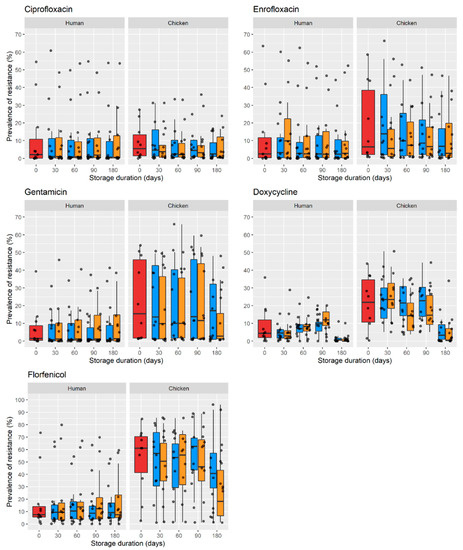 Prevalence of phenotypic AMR among E. coli from human and chicken fresh and freeze-stored faecal samples after 30, 60, 120, and 180 days. Red, fresh sample; blue, −80 °C; orange, −20 °C.