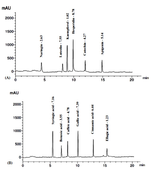 HPLC examination of the ERF of M. arboreus revealed the identification and quantification of 13 polyphenolic compounds (6 flavonoids and 7 phenolic acids), as shown in Table 4. The compounds were identified by comparison to authentic samples analyzed using the same procedures. Hesperidin and luteolin were the major flavonoids identified at concentrations of 8.78 and 7.55 µg/mg of the ERF. Gallic acid was the predominant phenolic component identified in the extract (7.39 µg/mg), followed by syringic acid (7.16 µg/mg) and cinnamic acid (6.44 µg/mg) (Figure 2, Table 4).