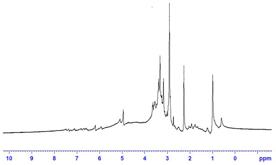 The 1HNMR spectrum of the ERF at 400 MHz (Figure 3) revealed that the extract is rich in oxygenated saturated and unsaturated hydrocarbon compounds. Signals in the range 0.0–4.0 ppm are predominant in the spectrum while signals in the aromatic range 6.0–8.0 ppm are weak. In correlation to the GC and HPLC analysis, the extract is rich in fatty acids (saturated and unsaturated), which explains why the fingerprint pattern as the characteristic signals for fatty acids are 2.0–2.5 ppm for (CH2), 3.0–4.0 ppm for (-CHOH-, CH3-CO-, -CH2-CO-), 5.0–6.0 ppm (-CH=CH-) [29].