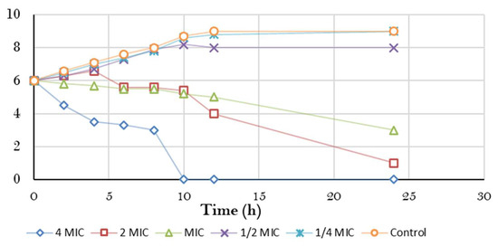 A time-kill kinetic assay of the ERF against marine V. damsela was investigated, with the results demonstrated in Figure 4. As a result, time-kill curve was plotted between the logarithmic number of CFU/mL and incubation time. At 4 × MIC concentration, the ERF showed a decrease in the amount of viable V. damsela at 8–24 h. The extent by which bacteria was inhibited by the plant extract by time varied greatly, as shown by killing analyses [33]. Therefore, the capacity of plant secondary metabolites to possess antibacterial characteristics may be taken into consideration, as well as their response to microbial infection [34].