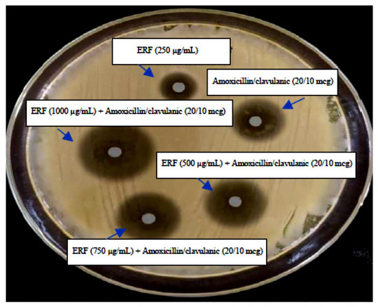 The ERF was tested in conjunction with amoxicillin/clavulanic acid using the standard disc diffusion method against selected marine V. damsela. The antibacterial activity was evaluated on an agar plate using discs made by combining amoxicillin/clavulanic acid (20/10 mcg) with different doses of ERF (250, 500, 750, and 1000 µg/mL). The antibacterial effectiveness of the ERF and amoxicillin/clavulanic combination was evaluated by measuring the size of the zone of inhibition after 24 h of incubation at 37 °C [25].