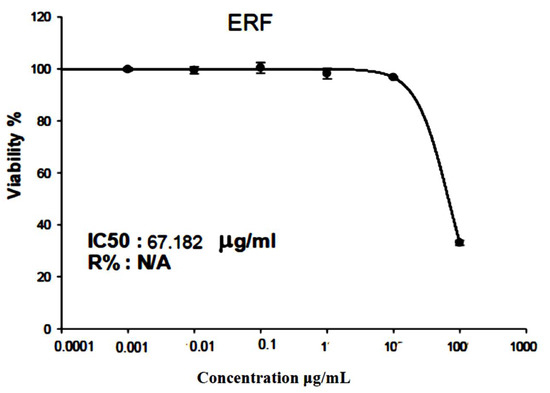 After 72 h of incubation, the SRB test was utilized to analyze the cytotoxicity of the ERF on the hepatocellular carcinoma (HepG2) cell line. The results showed that ERF significantly reduced HepG2 cell proliferation in a dose-dependent manner, with an IC50 value of 67.182 µg/µL (Figure 6 and Figure 7).