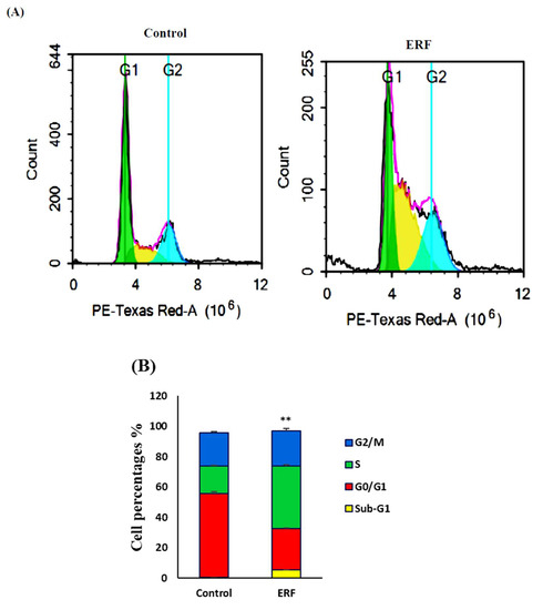 Representative flow cytometry analysis of HepG2 cells treated for 48 h with the IC50 of the ERF. DNA cytometry analysis was performed to examine cell cycle distribution, and diverse cell phases (A) were plotted as percentages of total occurrences (B). ** Significantly different from the control group; results are provided as mean ± SD; n = 3.