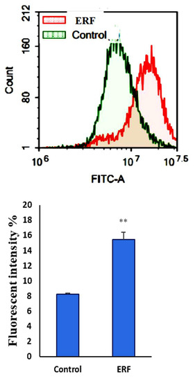 After being exposed to ERF, autophagic cell death was assessed in HepG2 cells. Cells were stained with a Cyto-ID autophagosome tracker after exposure to ERF for 24 h. ** Significantly different from the control group; data are presented as mean SD; n = 3.