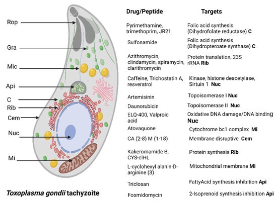 T. gondii tachyzoite drug targets. Rop, rohptry. Gra, dense granule. Mic micronemes. Api, apicoplast. C, cytoplasm. Cem, cell membrane. Rib, ribosome. Nuc, nucleus. Mi, mitochondrion. Created with BioRender.com under license to publish by Anacleto SJ.