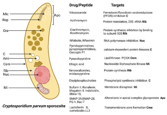 - Gargala, G. Drug treatment and novel drug target against Cryptosporidium. Parasite 2008, 15, 275–281. [Google Scholar] [CrossRef]