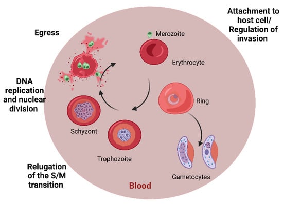 In humans, parasites replicate asexually, while sexual reproduction takes place in Anopheles mosquitoes. Sporozoites injected by the Anopheles mosquito while feeding, reach the liver through the bloodstream and invade hepatocytes forming merozoites [45]. In the liver, P. ovale and P. vivax sporozoites can convert into hypnozoites, which are dormant forms that can relapse months or years later [44]. After liver parasite replication, merozoites are released into the bloodstream, and the intraerythrocytic cycle begins, in which rings, trophozoites, schizonts, merozoites, and gametocytes are developed [43]. Gametocytes are ingested by Anopheles mosquitos, and the cycle begins again. In the midgut of the mosquito, gametocytes develop a zygote, then a mobile ookinete capable of traversing the intestinal wall and forming an oocyst that, when mature, will develop sporozoites that will be released to invade the salivary glands [46,47]. During the intraerythrocytic cycle (Figure 5), the clinical features observed include high fever, chills, headache, myalgias, arthralgias, nausea, vomiting, and diarrhea [48,49]. P. falciparum infections can cause complicated malaria as a consequence of the cytoadherence phenomenon in which infected erythrocytes adhere to the vascular endothelium of different organs, causing cerebral malaria, acute respiratory distress syndrome, acute renal failure, anemia, thrombocytopenia, and placental malaria [48]. The intensity of clinical manifestation during complicated malaria varies according to age and the intensity of transmission, and if not treated promptly, mortality is high [40].