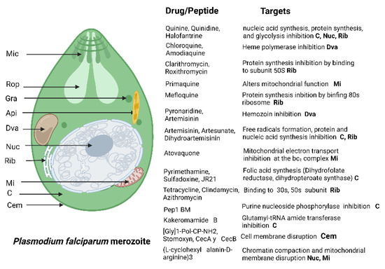 Other targets of peptides are proteins and membranes, which, if damaged, can modify the morphology of the parasite; however, not all peptides have parasiticidal effect, and some only stop the development of Plasmodium spp., which is reflected in the slowed kinetics of the life cycle [92,94,95,96,97,98].