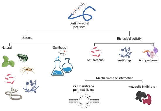 The need to categorize everything that is known has facilitated the management of information in different settings, and chemical structures also have their own classification according to the functional groups present in their chemical structures. However, peptides are made up of a series of amino acids that are present in different functional groups depending on their biological activities. According to various authors, AMPs can be categorized according to different features, such as their charges (cationic, anionic), biological activities (antibacterial, antifungal, antiprotozoal, etc.), mechanisms of action, and even the source from which they were isolated (either from natural sources or synthetically) (Figure 7). A general form of classification is based on their physicochemical characteristics, which can be divided into four main groups: (1) α-helices, (2) β-pleated sheets, (3) those with mixed structures, and (4) those with atypical conformations [51,52,53]. The α helical structure is characterized by coiling on itself through peptide bonds and creating a type of tube. This conformation, in addition to providing amphipathic characteristics, allows it to be easily inserted into the cell membrane, creating channels [54]. β-pleated sheets are structures that fold back on themselves through N-H bonds of amino acids that conform by forming hydrogen bonds with the C=O groups of the opposite amino acids. Mixed structures can be present, within the same chain of amino acids, of the two conformations, both helical and β-pleated sheets. Finally, the atypical structures present forms that do not correspond to those mentioned above [55,56,57].