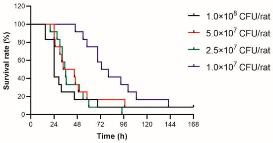 Rats were transiently rendered neutropenic by intraperitoneal administration of two doses of cyclophosphamide (100 mg/kg on day 0 (5 days before infection) plus 75 mg/kg on day 4 (1 day before infection)) [31]. The glycerol bacteria (Pseudomonas aeruginosa ATCC 9027) stored at −80 °C were thawed and then cultured in MHB at 37 °C under a rotation speed of 180 rpm to the logarithmic phase. The fresh broth culture of bacteria was diluted serially with sterile saline to obtain different working suspensions for injection at 1 × 108 CFU/mL, 5 × 107 CFU/mL, 2.5 × 107 CFU/mL, and 1 × 107 CFU/mL. On day 5, the neutropenic rats were randomized into five groups (four treatment groups + one control group), each containing 12 animals (six females and six males). The treatment groups were intraperitoneally injected with 1 mL of Pseudomonas aeruginosa ATCC 9027 at different bacterial concentrations, and the control group was intraperitoneally injected with 1 mL sterile saline. After infection, rats were observed for physical conditions and mortality for 7 days. The optimal load of bacterial suspensions for the rat sepsis model was determined based on the criterion of about 50% of lethality rate after 2 to 3 days infection [32].
