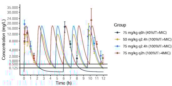 By combining the determined MIC of Pseudomonas aeruginosa ATCC 9027 (0.125 mg/L), PPB (15%), and BPR (0.65) of meropenem, the relevant meropenem dosing regimens attaining different PK/PD targets (40%fT > MIC, 100%fT > MIC, and 100%fT > 4 × MIC) were determined by PK model simulation using R Version 4.2.0 (R Foundation for Statistical Computing, Vienna, Austria).
