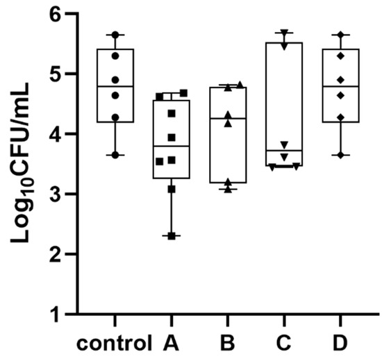 The box-plot distribution of bacteria counts in blood samples from sepsis rats following 12 h of treatment with meropenem. The dosing regimens for the treatment groups of A, B, C, and D were 75 mg/kg/q6h (40%fT > MIC), 75 mg/kg/q2.4h (100%fT > MIC), 50 mg/kg/q2.4h (100%fT > MIC), and 75 mg/kg/q2h (100%fT > 4 × MIC), respectively. The control group received equal volume of sterile saline.