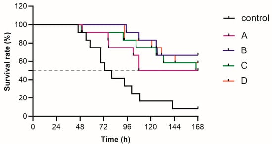 The mortality of the animals was monitored for 7 days, and the times of death were carefully monitored. A Kaplan–Meier (KM) survival curve for each group was constructed using GraphPad Prism v.8.1 (GraphPad Software, San Diego, CA, USA). The log-rank test was conducted to test difference in survival between different groups, and a p value <0.05 was considered statistically significant. Also, the hazard ratio was calculated between different groups.