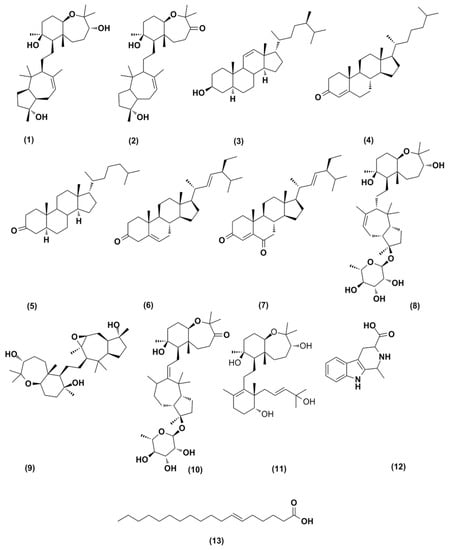 - Sandjo, L.P.; Rincheval, V.; Ngadjui, B.T.; Kirsch, G. Cytotoxic effect of some pentacyclic triterpenes and hemisynthetic derivatives of stigmasterol. Chem. Nat. Compd. 2011, 47, 731–734. [Google Scholar] [CrossRef]