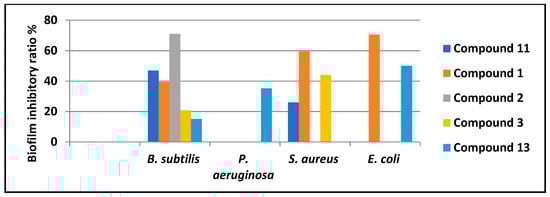 As demonstrated from the antimicrobial screening, metabolites (3) and (11), and (13) exhibit a considerable inhibition against some bacterial strains. As a result, those compounds may have the potential to inhibit biofilm formation. According to a recent analysis [], numerous categories of natural compounds, such as metabolites originating from marine invertebrates, can prevent the growth of biofilms and are hence suitable for adjuvant therapy as supplements to the standard antibiotics. Therefore, DCM fraction and isolated compounds were tested for their anti-biofilm activities in Bacillus subtilis (ATCC 5230), Staphylococcus aureus (ATCC 25923), Pseudomonas aeruginosa (ATCC 9027), and Escherichia coli (ATCC 25922) and each of these bacteria’s biofilms was compared to the control (untreated biofilms). As a result, compound (1) exhibited a powerful biofilm inhibitory activity in S. aureus and E. coli, while compound (2) displayed a significant inhibition in B. subtilis (Figure 2). To the best of our knowledge, none of the derivatives of sipholane have been linked to a reduction in the development of biofilms by human pathogens. Therefore, additional mechanistic research on these compounds is required.