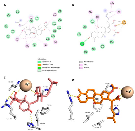 Binding mode of compound 11 and fusidic acid inside the binding site of EF-G (PDB ID: 7N2C) using 2D (A and B, respectively) and 3D representations (C and D, respectively).