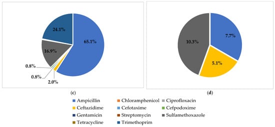 Proportion of phenotypic AMR for different species of bacteria. (a): E. coli; (b): S. enterica subsp. enterica; (c): V. parahaemolyticus; (d): V. cholerae.